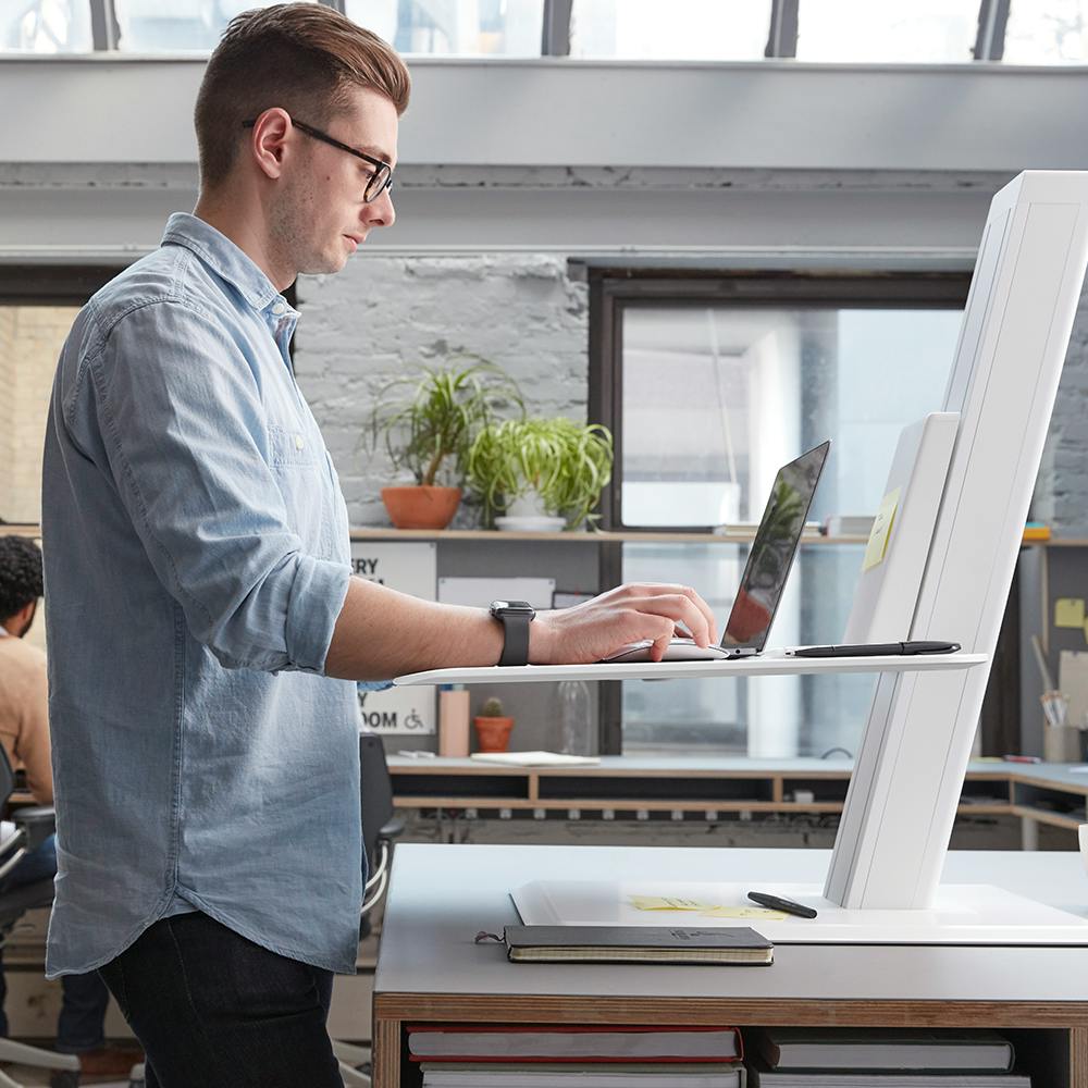 Humanscale’s QuickStand Eco supports all workstyles, single or double monitor arms, or the everyday laptop user.